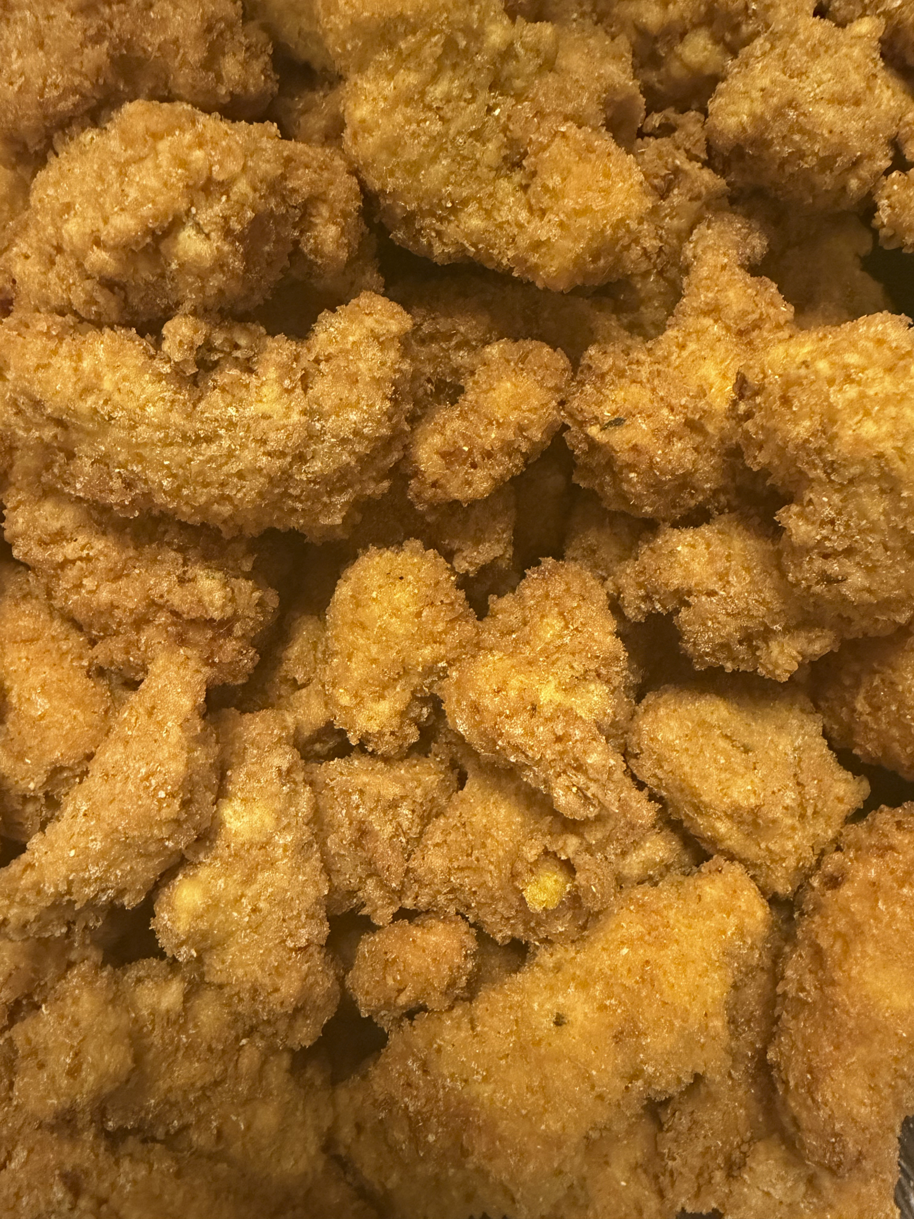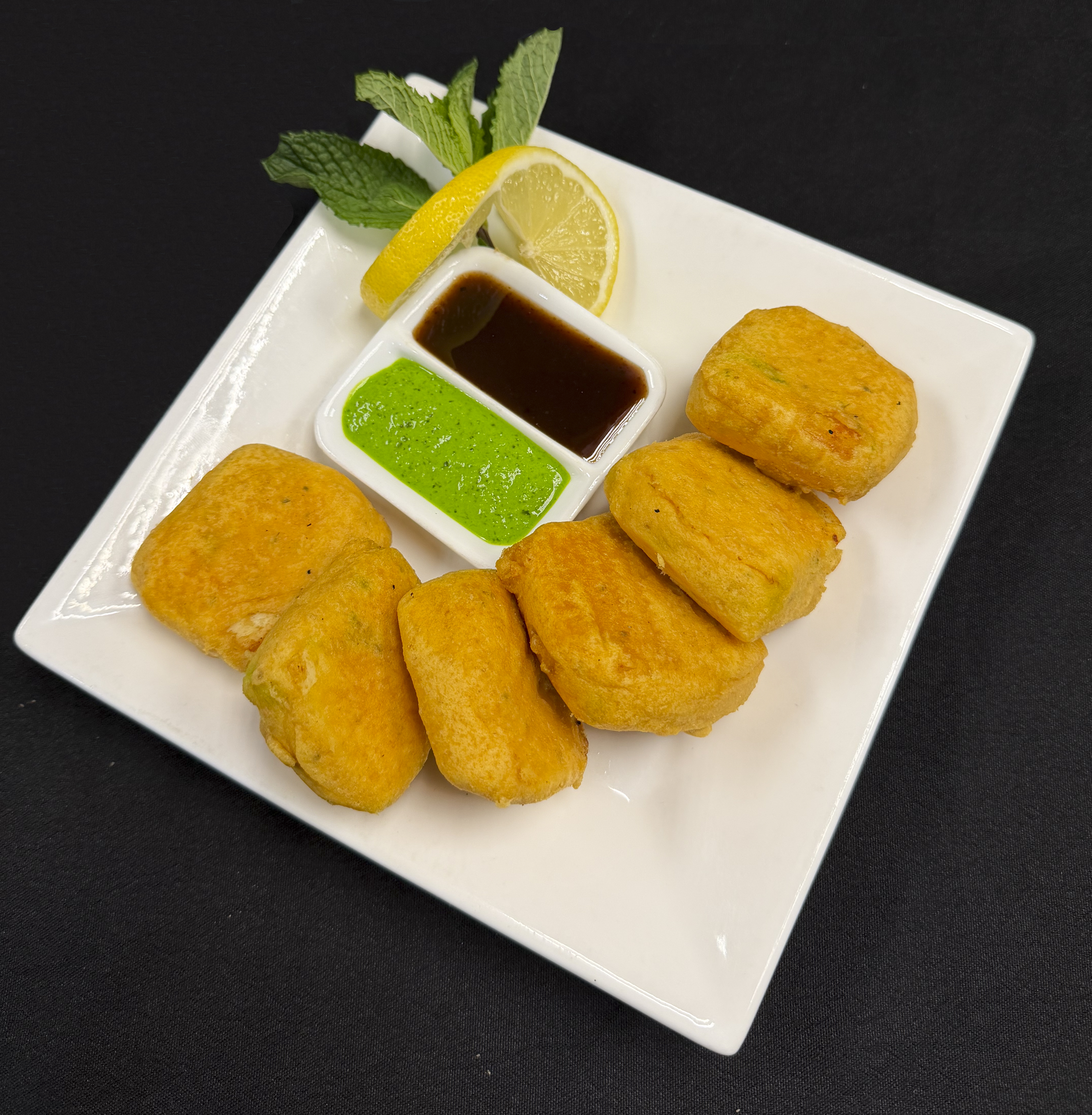 Boneless chicken dipped in chickpea batter and bread crumbs, deep fried and seasoned with fresh spices. Around 15 pieces.
