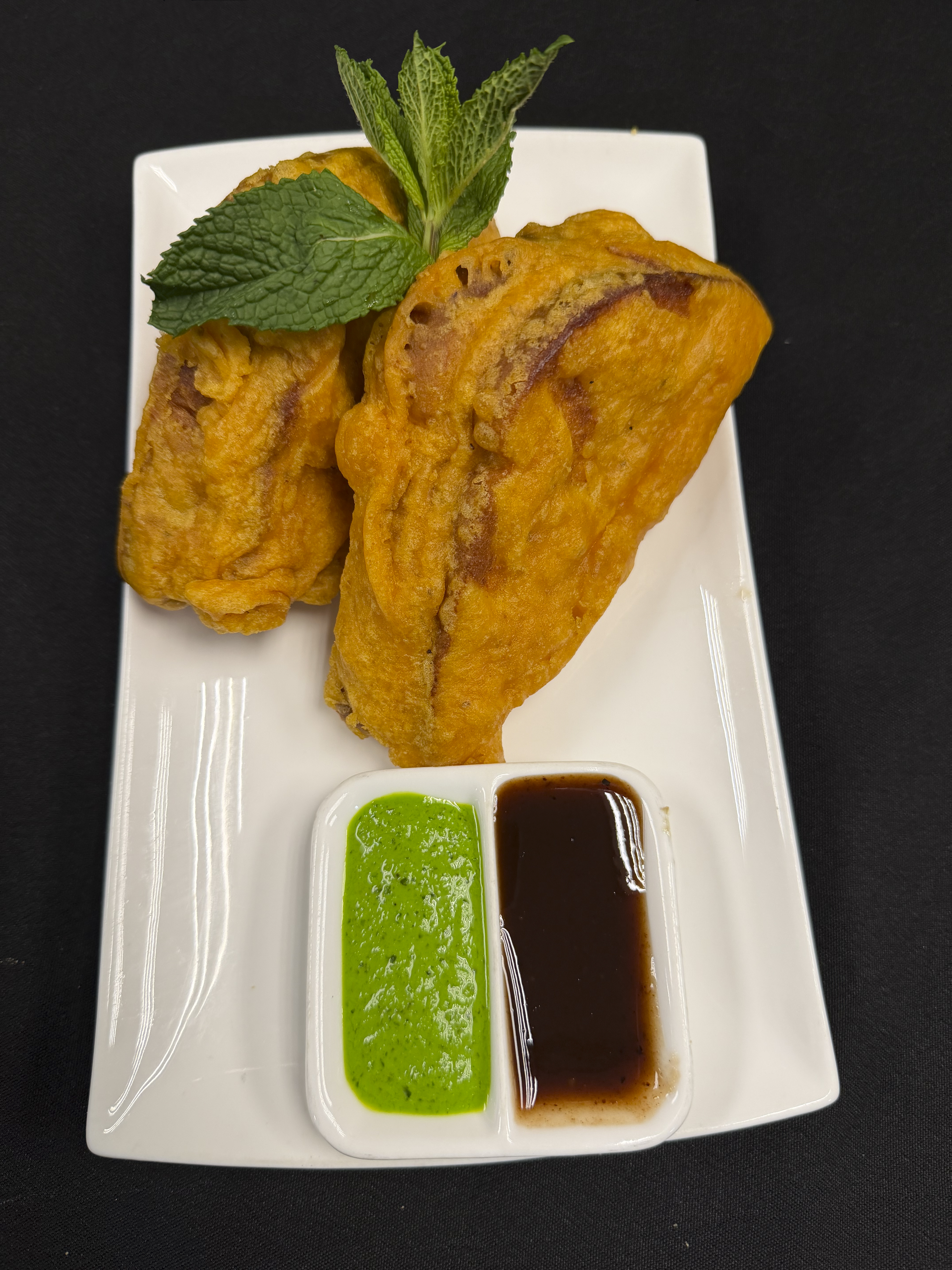 Deep-fried bread stuffed with a spiced potato filling, coated in gram flour batter, and fried until crisp and golden brown.