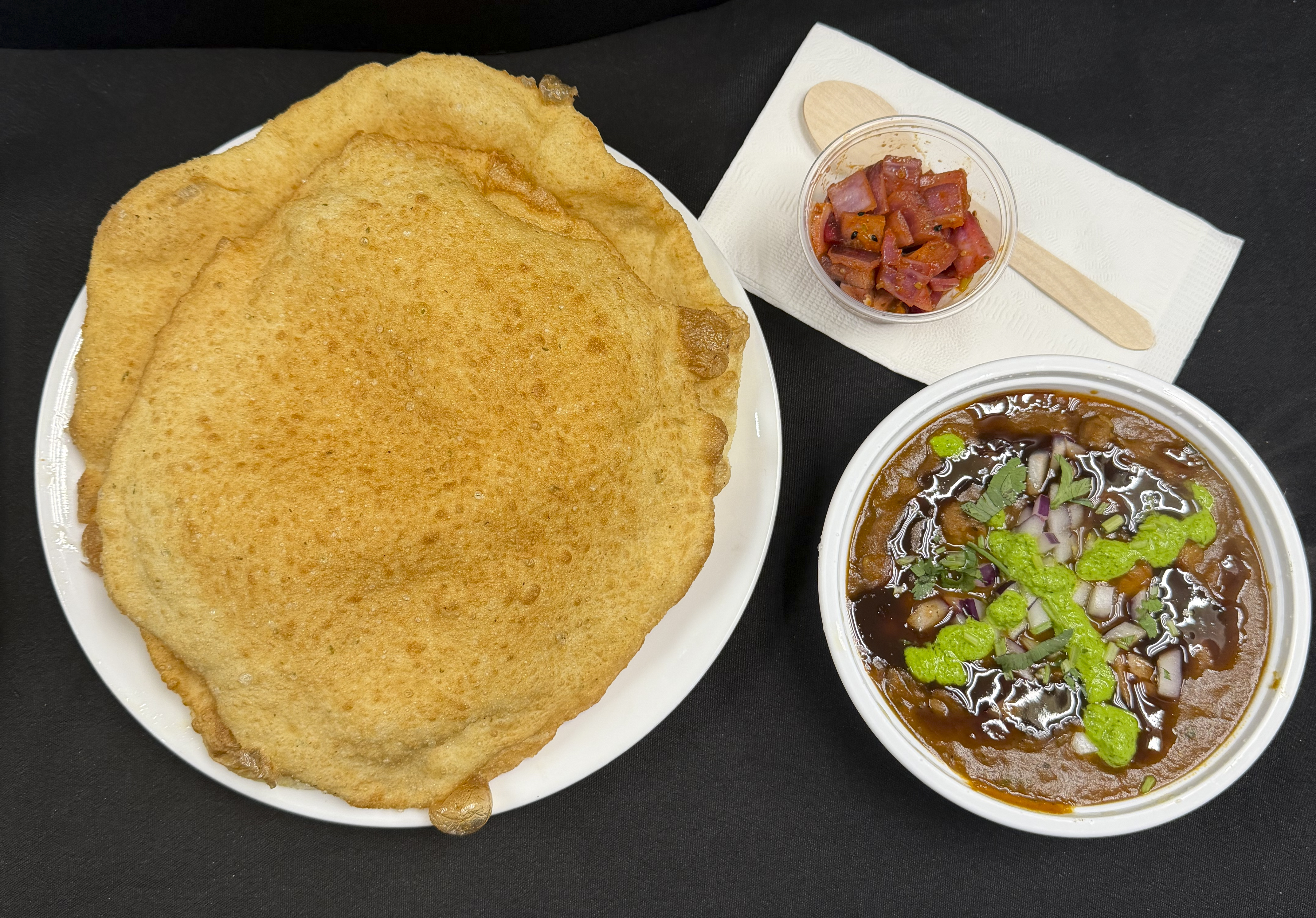 Soft and crispy stuffed flatbread, filled with spiced potatoes, paneer, and cauliflower, and baked in the tandoor, served with 8 oz chana and pickles.